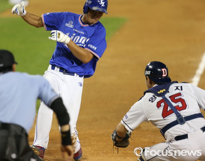 (서울=포커스뉴스) 19일 서울 잠실구장에서 열린 2016 프로야구 삼성-두산 경기 6회초 1사 3루에서 삼성 박해민의 2루수 앞 땅볼때 3루주자 구자욱이 홈에서 태그아웃되고 있다.