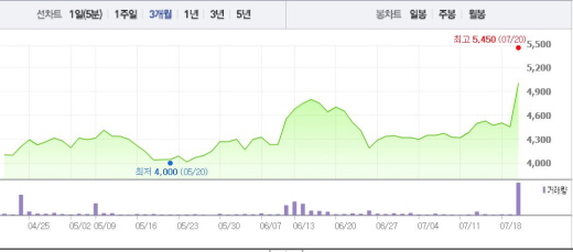 KT뮤직은 20일 오전 9시34분 현재 전 거래일 대비 11.11%(495원) 상승한 4950원에 거래되고 있다.