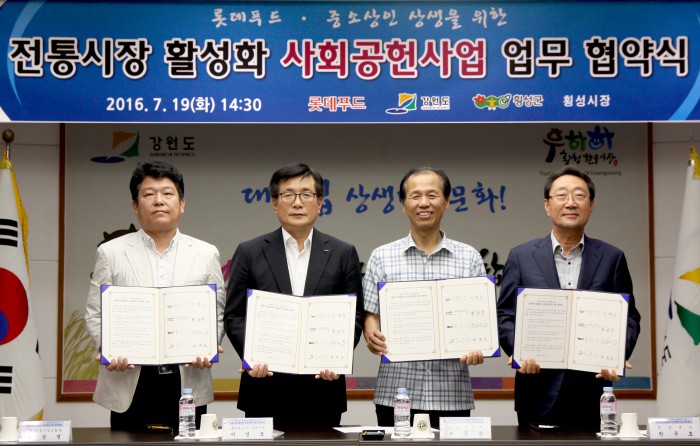 지난 19일 롯데푸드는 강원도, 횡성군, 횡성시장조합과 '전통시장 활성화 사회공헌사업 업무 협약'을 체결했다고 다음날인 20일 밝혔다.