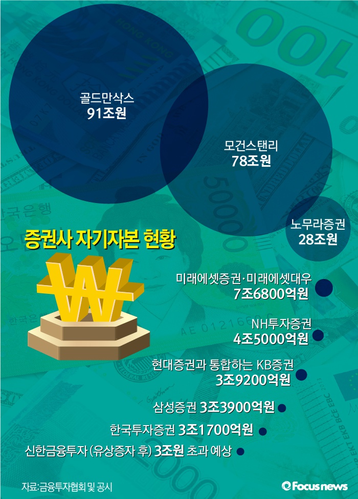 (서울=포커스뉴스) 현재 자기자본 3조원을 넘는 증권사는 미래에셋증권·미래에셋대우(7조6800억원), NH투자증권(4조5000억원), 현대증권과 통합하는 KB증권(3조9200억원), 삼성증권(3조3900억원), 한국투자증권(3조1700억원)이다. 여기에 최근 5000억원 이상의 유상증자를 추진하기로 한 신한금융투자까지 포함하면 총 6곳이다.