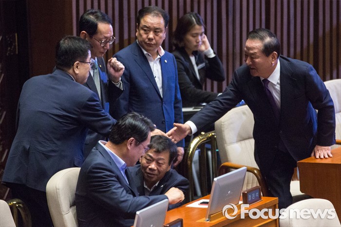 (서울=포커스뉴스) 새누리당 8.9 전당대회 불출마를 선언한 서청원(오른쪽) 의원이 20일 오전 서울 여의도 국회에서 열린 344회 국회(임시회) 2차 본회의, 사드(THAAD, 고고도미사일방어체계) 배치에 대한 긴급현항질문에 참석해 김광림(왼쪽) 정책위의장과 악수 하고 있다.