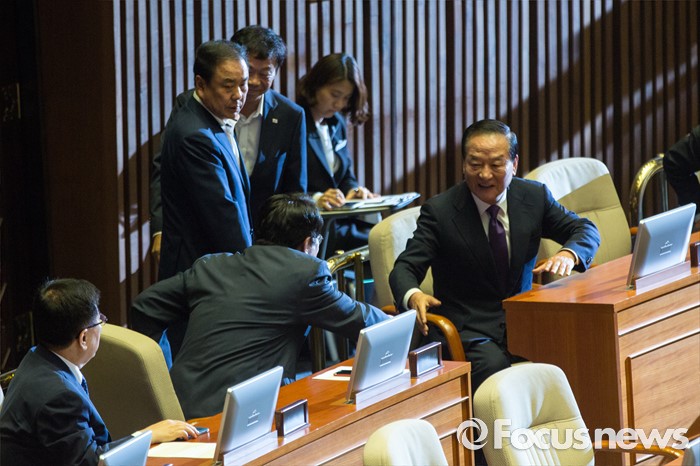 (서울=포커스뉴스) 새누리당 8.9 전당대회 불출마를 선언한 서청원 의원이 20일 오전 서울 여의도 국회에서 열린 344회 국회(임시회) 2차 본회의, 사드(THAAD, 고고도미사일방어체계) 배치에 대한 긴급현항질문에 참석해 정진석 원내대표와 악수 하고 있다.