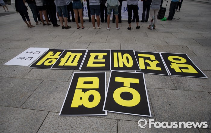 (서울=포커스뉴스) 당진시 송전선로 석탄화력 저지 범시민대책위원회 관계자들과 환경단체 회원들이 20일 오전 서울 종로구 광화문 광장에서 당진 에코파워 석탄화력발전소에 대한 전원개발실시계획 승인 신청 반려를 촉구하고 있다.