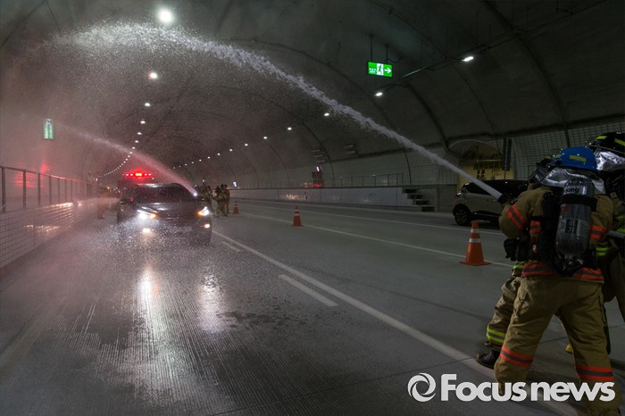 (서울=포커스뉴스) 20일 오후 서울 관악구 봉천터널 내에서 서초소방서, 방배경찰서 대원들이 강남순환도로 화재대응 유관기관 합동훈련을 하고 있다.