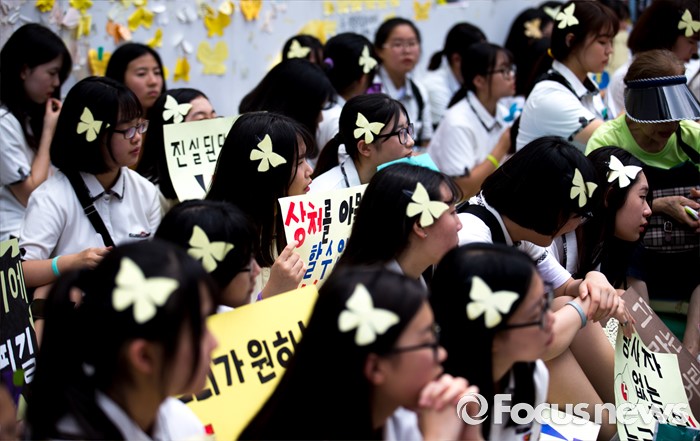 | △ 머리 위 노란 나비 달고 있는 수요집회 참석한 학생들 |