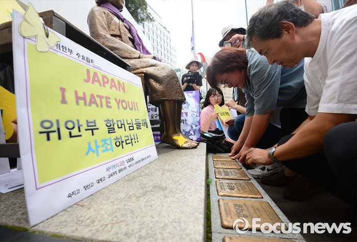 (서울=포커스뉴스) 20일 오후 서울 종로구 옛 일본대사관 앞에서 열린 제1240차 일본군 위안부 문제해결을 위한 정기 수요집회에서 평화의 소녀상 작가 김서경씨가 위안부 할머니들의 이름이 새겨진 동판을 붙이는 평화의 디딤돌 퍼포먼스를 하고 있다.