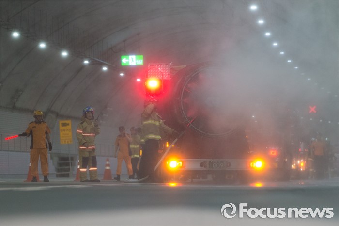 (서울=포커스뉴스) 20일 오후 서울 관악구 봉천터널 내에서 서초소방서, 방배경찰서 대원들이 강남순환도로 화재대응 유관기관 합동훈련을 하고 있다.