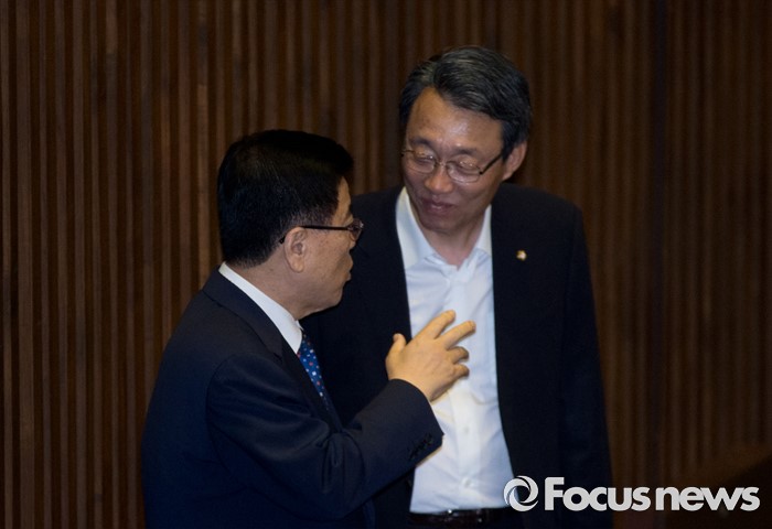 (서울=포커스뉴스) 20일 오후 서울 여의도 국회에서 열린 344회 국회(임시회) 2차 본회의, 사드(THAAD·고고도미사일방어체계) 배치에 대한 긴급현안질문에 참석한 김광림(왼쪽) 새누리당 정책위의장과 김성식 국민의당 정책위의장이 대화하고 있다.