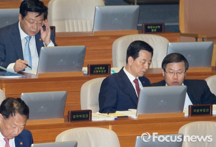 (서울=포커스뉴스) 20일 오후 서울 여의도 국회에서 열린 344회 국회(임시회) 2차 본회의, 사드(THAAD·고고도미사일방어체계) 배치에 대한 긴급현안질문에 참석한 한민구(오른쪽 두번째) 국방부 장관과 황희종 기조실장이 대화하고 있다.