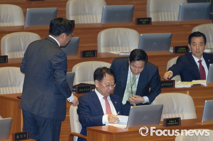 | △ 오후 답변 준비하는 유일호 부총리 |