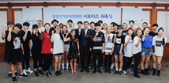 (서울=포커스뉴스) 20일 오후 경기도 과천 중앙선거관리위원회에서 열린 아름다운 선거문화 조성을 위한 서포터즈 위촉식에 참석한 김용희 사무총장이 서포터즈로 위촉된 팝바이올리니스트 유에스더, 댄스팀 제로백과 함께 기념촬영을 하고 있다. <사진제공=중앙선관위>