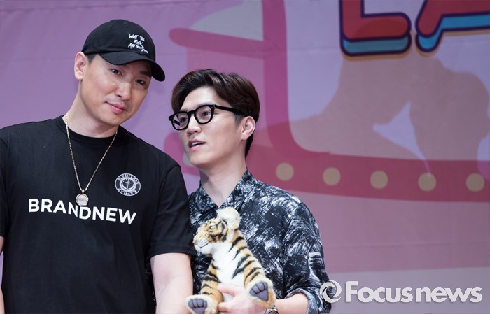 (서울=포커스뉴스) 20일 오후 서울 마포구 누리꿈스퀘어에서 열린 Mnet '서바이벌 모모랜드를 찾아서' 제작발표회에 참석한 음악프로듀서 라이머(왼쪽)와 이단옆차기가 대화를 나누고 있다.