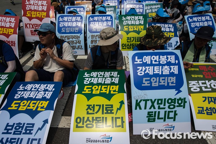 (서울=포커스뉴스) 20일 오후 서울 여의도 산업은행 앞에서 '민주노총 총파업 총력투쟁' 결의대회가 열리고 있다. 이번 결의대회에서 민노총 조합원들은 한상균 민노총 위원장 실형선고, 성과연봉제 등을 규탄했다.
