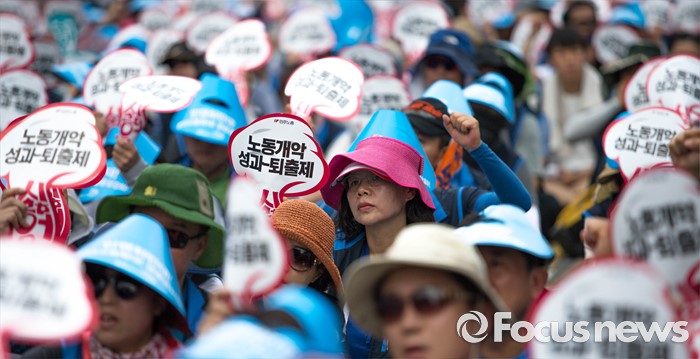 (서울=포커스뉴스) 20일 오후 서울 여의도 산업은행 앞에서 '민주노총 총파업 총력투쟁' 결의대회가 열리고 있다. 이번 결의대회에서 민노총 조합원들은 한상균 민노총 위원장 실형선고, 성과연봉제 등을 규탄했다.