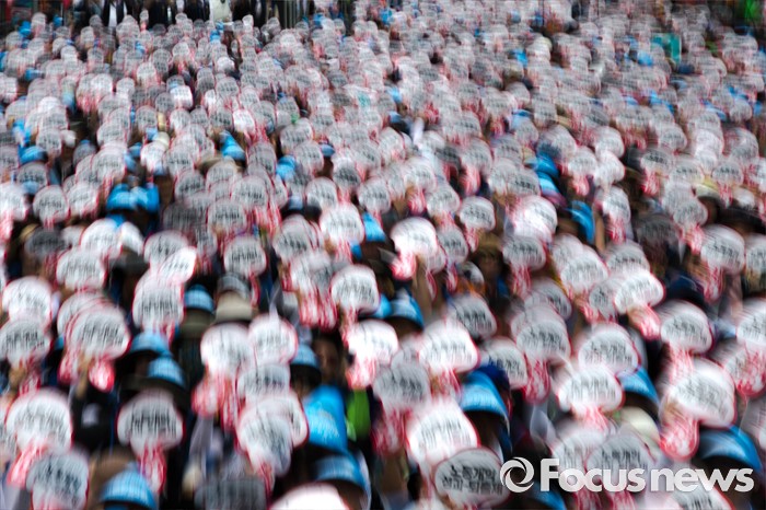 (서울=포커스뉴스) 20일 오후 서울 여의도 산업은행 앞에서 '민주노총 총파업 총력투쟁' 결의대회가 열리고 있다. 이번 결의대회에서 민노총 조합원들은 한상균 민노총 위원장 실형선고, 성과연봉제 등을 규탄했다.