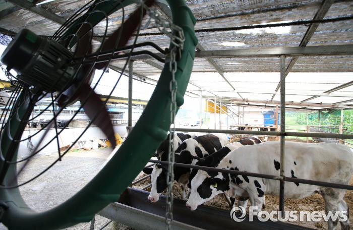 (세종=포커스뉴스) 폭염주의보가 발령된 20일 오후 세종시 한 농장에서 젖소들이 대형 선풍기 바람에 더위를 식히고 있다.