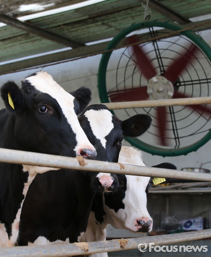 (세종=포커스뉴스) 폭염주의보가 발령된 20일 오후 세종시 한 농장에서 젖소들이 대형 선풍기 바람에 더위를 식히고 있다.