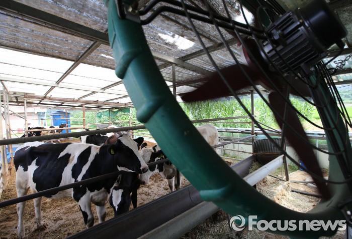 (세종=포커스뉴스) 폭염주의보가 발령된 20일 오후 세종시 한 농장에서 젖소들이 대형 선풍기 바람에 더위를 식히고 있다.