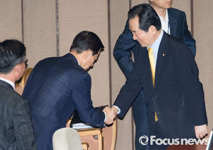 (서울=포커스뉴스) 20일 오후 서울 여의도 국회에서 344회 국회(임시회) 2차 본회의, 사드(THAAD·고고도미사일방어체계) 배치에 대한 긴급현안질문이 산회된 후 정세균(오른쪽) 국회의장과 한민구 국방부 장관 등이 악수하고 있다.