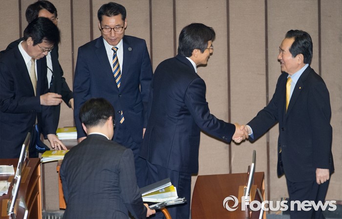 (서울=포커스뉴스) 20일 오후 서울 여의도 국회에서 344회 국회(임시회) 2차 본회의, 사드(THAAD·고고도미사일방어체계) 배치에 대한 긴급현안질문이 산회된 후 정세균(오른쪽) 국회의장과 황교안 국무총리가 악수하고 있다.
