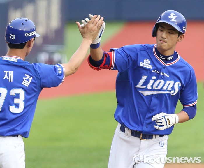 (서울=포커스뉴스) 20일 서울 잠실구장에서 열린 2016 프로야구 삼성-두산 경기 1회초 삼성 선두타자 구자욱이 좌츳 폴대를 맞히는 홈런을 치고 3루를 돌아 김재걸 코치의환영을 받고 있다.