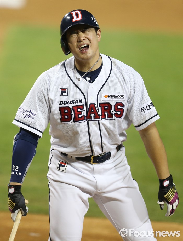 (서울=포커스뉴스) 20일 서울 잠실구장에서 열린 2016 프로야구 삼성-두산 경기 6회말 21사 1,2루에서 두산 김재환이 헛스윙 삼진 아웃을 당하고 크게 아위워하고 있다.