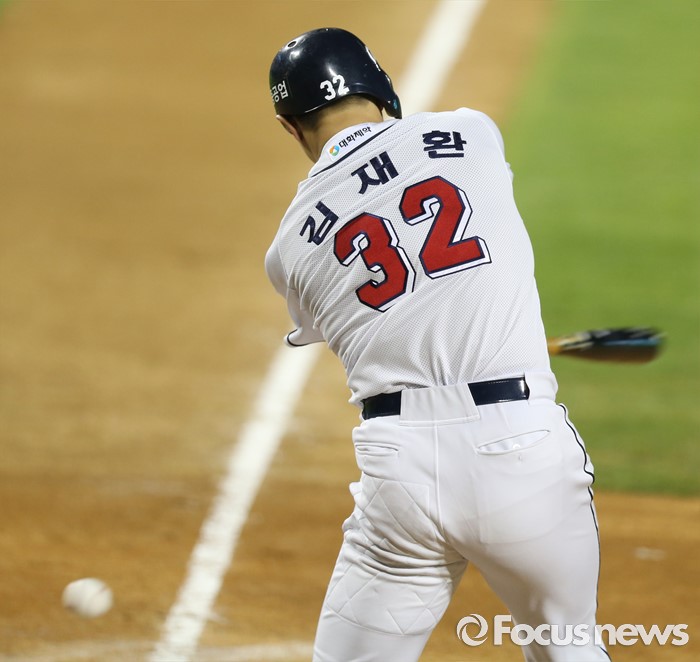 (서울=포커스뉴스) 20일 서울 잠실구장에서 열린 2016 프로야구 삼성-두산 경기 6회말 2사 1,2루에서 두산 김재환이 헛스윙 삼진 아웃을 당하고 있다.