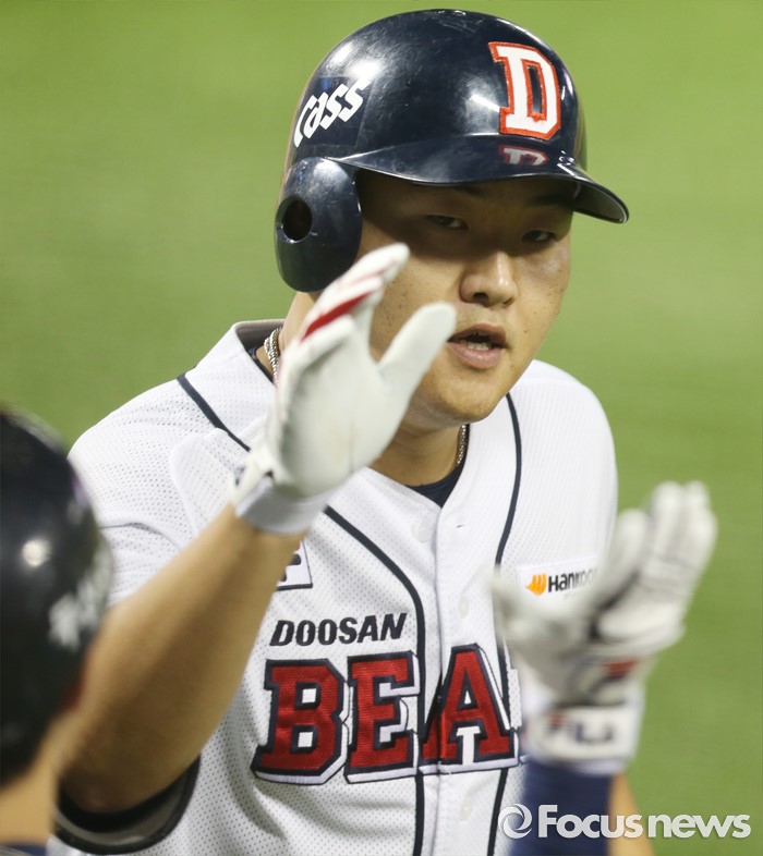 (서울=포커스뉴스) 20일 서울 잠실구장에서 열린 2016 프로야구 삼성-두산 경기 7회말 2사 1루에서 두산 대타 오재일이 우월 홈런을 치고