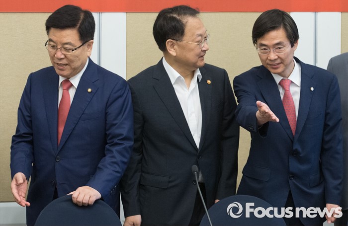 (서울=포커스뉴스) 21일 오전 서울 여의도 국회 귀빈식당에서 열린 2016년 세법개정 당정협의에 참석한 김광림(왼쪽부터) 새누리당 정책위의장, 유일호 경제부총리 겸 기획재정부 장관, 조경태 기획재정위원장이 기념촬영을 마친 뒤 자리로 향하고 있다.