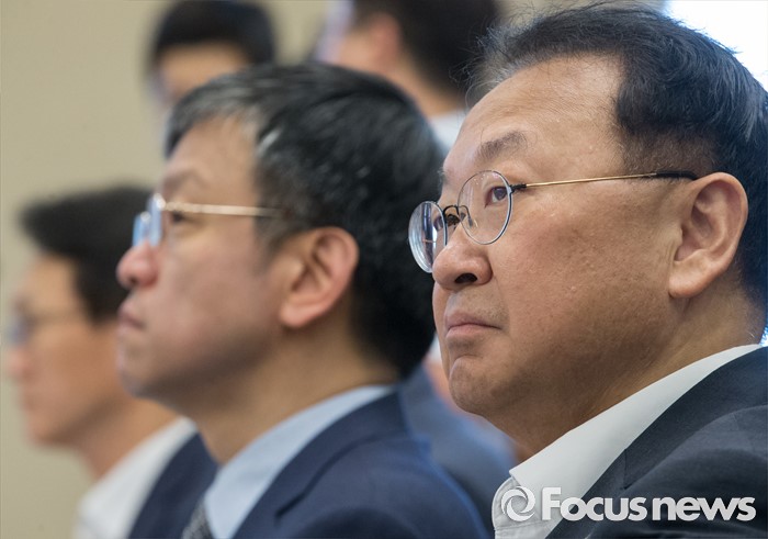(서울=포커스뉴스) 21일 오전 서울 여의도 국회 귀빈식당에서 열린 2016년 세법개정 당정협의에 참석한 유일호 경제부총리 겸 기획재정부 장관이 김광림 새누리당 정책위의장의 모두발언을 듣고 있다.