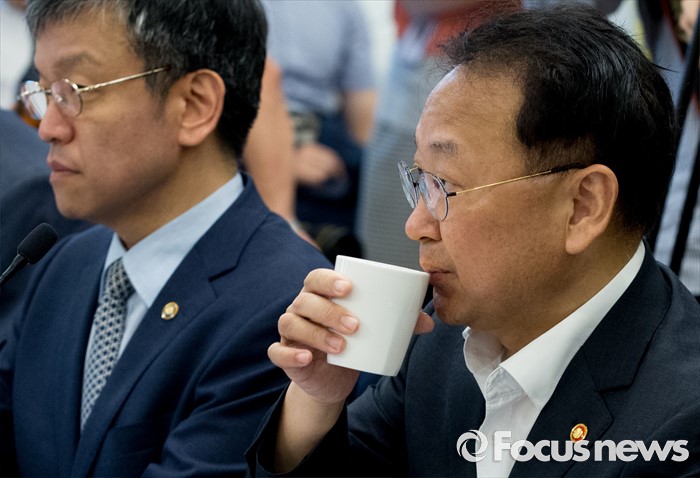(서울=포커스뉴스) 21일 오전 서울 여의도 국회 귀빈식당에서 열린 2016년 세법개정 당정협의에 참석한 유일호 경제부총리 겸 기획재정부 장관이 물을 마시고 있다.