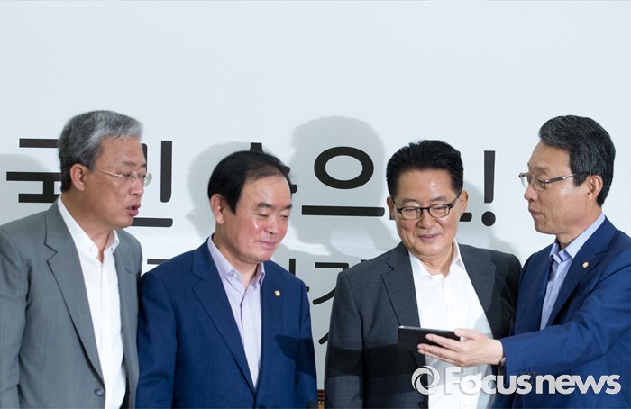 (서울=포커스뉴스) 21일 오전 서울 여의도 국회에서 열린 국민의당 원내정책회의에 참석한 박지원 비대위원장과 김성식 정책위의장 등 의원들이 당사에서 진행 중인 사드배치 반대 필리버스터 온라인 방송을 핸드폰으로 시청하고 있다. 왼쪽부터 유성엽 교육문화체육관광위원장, 장병완 산업통상자원위원장, 박 비대위원장, 김 정책위의장.