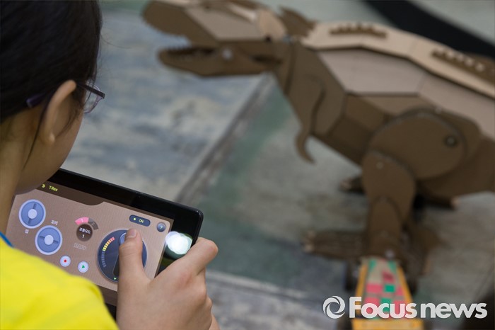(서울=포커스뉴스) 21일 오전 서울 강남구 코엑스에서 열린 '2016 청소년 발명 페스티벌'에 참여한 한 학생이 스마트폰을 이용해 공룡모형을 조작하고 있다.