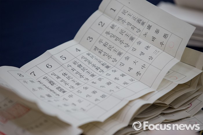 (서울=포커스뉴스) 20일 오전 서울 종로구 선거연수원에서 개표사무원들이 1987년 제13대 대통령선거 구로구을 우편투표함에서 꺼낸 투표용지를 계수하고 있다.