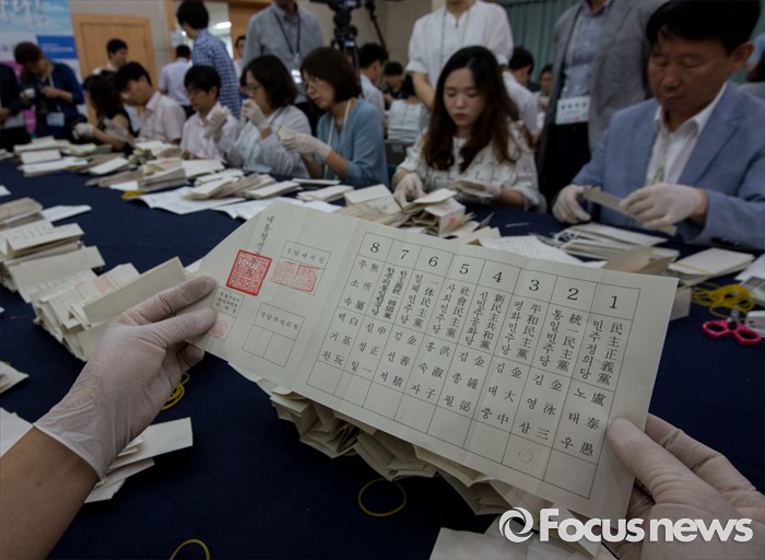 (서울=포커스뉴스) 20일 오전 서울 종로구 선거연수원에서 개표사무원들이 1987년 제13대 대통령선거 구로구을 우편투표함에서 꺼낸 투표용지를 계수하고 있다.