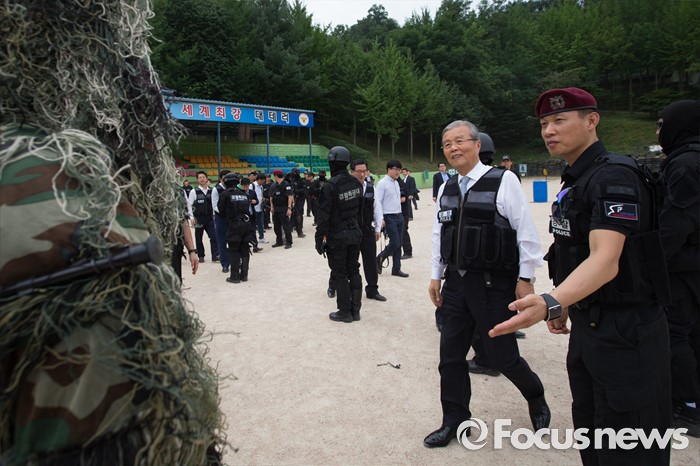 (서울=포커스뉴스) 김종인 더불어민주당 비상대책위원회 대표가 21일 오전 서울 서초구 경찰특공대를 방문해 대테러 훈련 시범 참관을 마치고 훈련한 경찰특공대원들을 격려하고 있다.