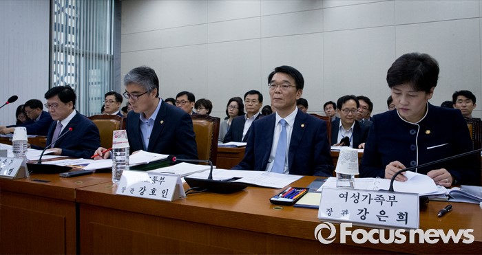 (서울=포커스뉴스) 21일 오전 서울 여의도 국회에서 열린 저출산·고령화대책 특별위원회 전체회의에 참석한 강은희(오른쪽부터) 여성가족부 장관, 강호인 국토교통부 장관, 이영 교육부 차관, 정진엽 보건복지부 장관이 자료를 살펴보고 있다.