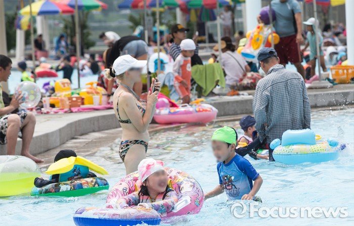 (서울=포커스뉴스) 21일 오후 서울 광진구 뚝섬 한강공원 수영장을 찾은 시민들이 물놀이를 즐기고 있다.