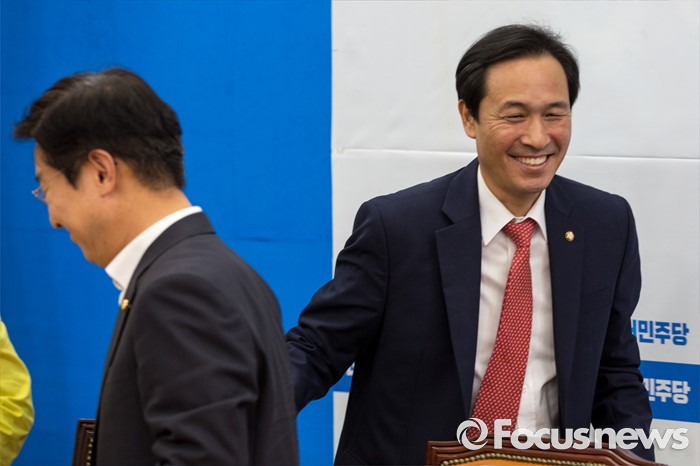 (서울=포커스뉴스) 우상호 더불어민주당 원내대표가 18일 오후 서울 여의도 국회에서 열린 '민주주의회복TF 검찰개혁 대책회의'에 참석하기 위해 회의실로 들어서고 있다.