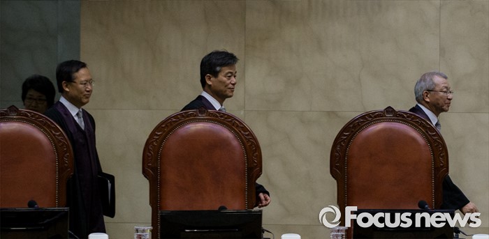 (서울=포커스뉴스) 양승태 대법원장과 대법관들이 21일 오후 의료법 위반 혐의로 기소된 치과의사 정모씨(48)에 대한 상고심 전원합의체 선고를 위해 서울 서초동 대법원 대법정에 자리하고 있다. 대법원은 이날 치과의사의 보톡스 진료가 의료법 위반이 아니다는 취지로 '치과의사의 보톡스 진료는 유죄'라는 판결을 파기 환송했다.