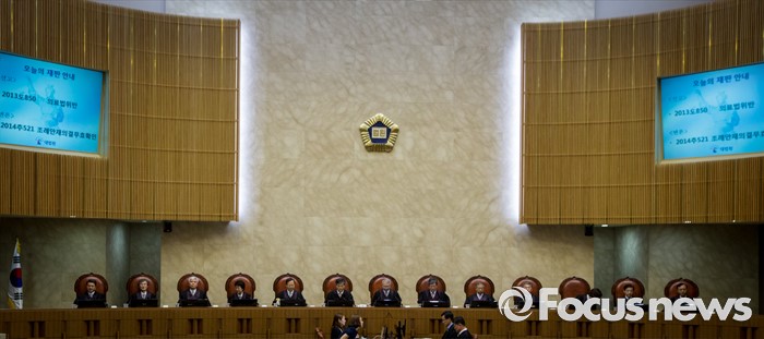 (서울=포커스뉴스) 양승태 대법원장과 대법관들이 21일 오후 의료법 위반 혐의로 기소된 치과의사 정모씨(48)에 대한 상고심 전원합의체 선고를 위해 서울 서초동 대법원 대법정에 자리하고 있다. 대법원은 이날 치과의사의 보톡스 진료가 의료법 위반이 아니다는 취지로 '치과의사의 보톡스 진료는 유죄'라는 판결을 파기 환송했다.
