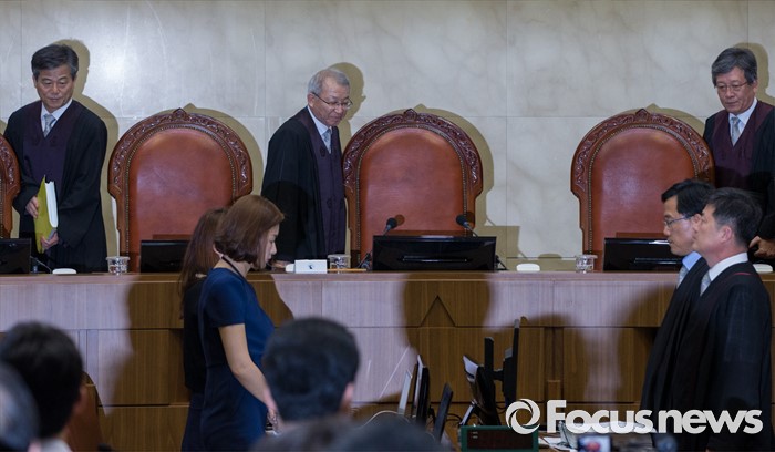 (서울=포커스뉴스) 양승태 대법원장과 대법관들이 21일 오후 의료법 위반 혐의로 기소된 치과의사 정모씨(48)에 대한 상고심 전원합의체 선고를 위해 서울 서초동 대법원 대법정에 자리하고 있다. 대법원은 이날 치과의사의 보톡스 진료가 의료법 위반이 아니다는 취지로 '치과의사의 보톡스 진료는 유죄'라는 판결을 파기 환송했다.