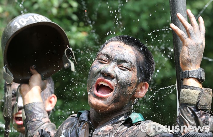 (논산=포커스뉴스) 폭염경보가 발령된 21일 충남 논산 연무읍 육군훈련소 각계전투종합훈련장에서 26교육연대 3교육대 훈련병들이 훈련을 받고 샤워를 하며 더위를 식히고 있다.