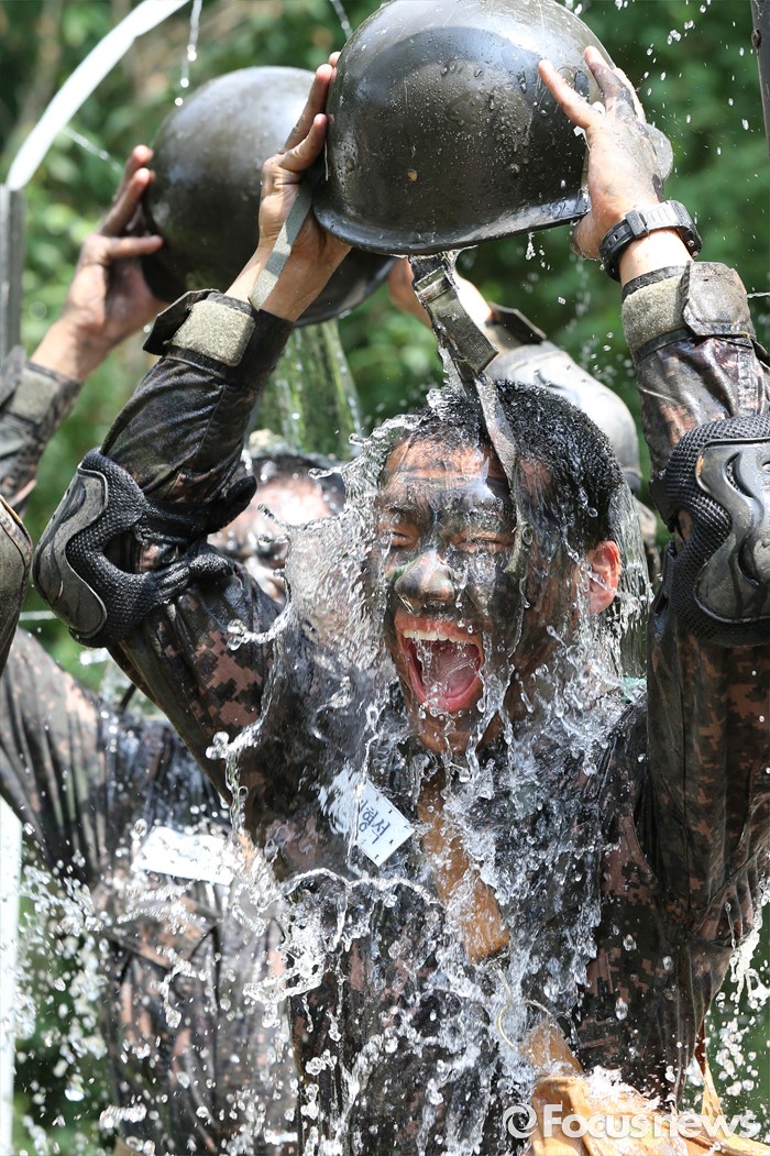 (논산=포커스뉴스) 폭염경보가 발령된 21일 충남 논산 연무읍 육군훈련소 각계전투종합훈련장에서 26교육연대 3교육대 훈련병들이 훈련을 받고 샤워를 하며 더위를 식히고 있다.