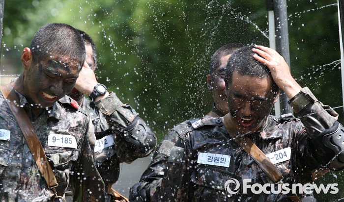 (논산=포커스뉴스) 폭염경보가 발령된 21일 충남 논산 연무읍 육군훈련소 각계전투종합훈련장에서 26교육연대 3교육대 훈련병들이 훈련을 받고 샤워를 하며 더위를 식히고 있다.