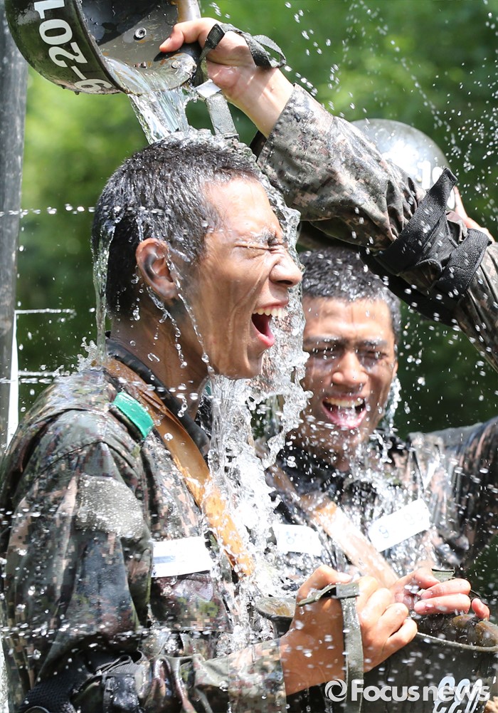 (논산=포커스뉴스) 폭염경보가 발령된 21일 충남 논산 연무읍 육군훈련소 각계전투종합훈련장에서 26교육연대 3교육대 훈련병들이 훈련을 받고 샤워를 하며 더위를 식히고 있다.