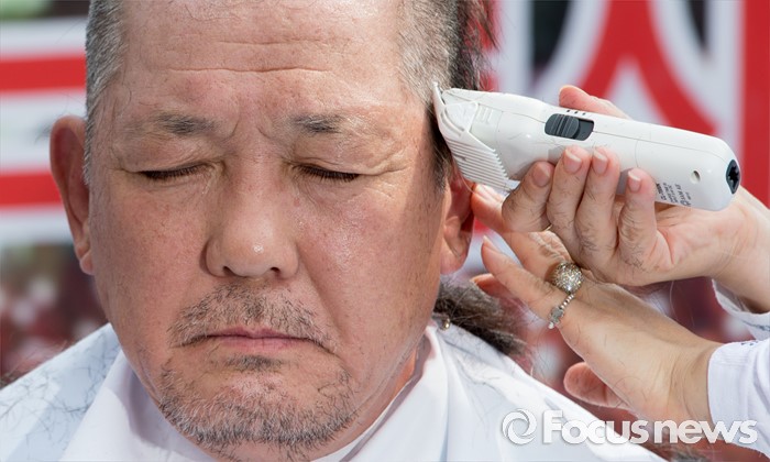 (서울=포커스뉴스) 21일 오후 서울역 광장에서 사드 배치 반대를 요구하는 김항곤 성주군수가 상경집회에 참가해 삭발식을 하고 있다.