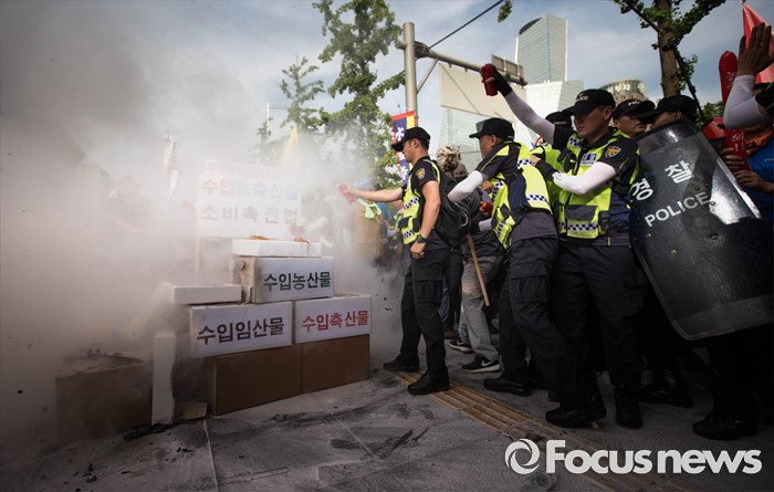 (서울=포커스뉴스) 21일 오후 서울 여의도 산업은행 본점 앞에서 농축산물의 김영란법 적용 제외를 요구하는 전국 농축산인 총궐기대회가 열린 가운데 수입농축산물 모형에 불을 붙이는 퍼포먼스가 진행되자 경찰병력이 급히 진화에 나서고 있다.
