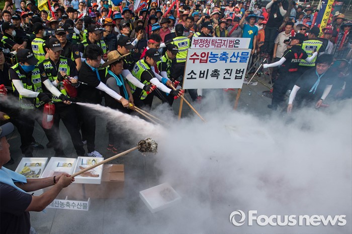 (서울=포커스뉴스) 21일 오후 서울 여의도 산업은행 본점 앞에서 농축산물의 김영란법 적용 제외를 요구하는 전국 농축산인 총궐기대회가 열린 가운데 수입농축산물 모형에 불을 붙이는 퍼포먼스가 진행되자 경찰병력이 급히 진화에 나서고 있다.