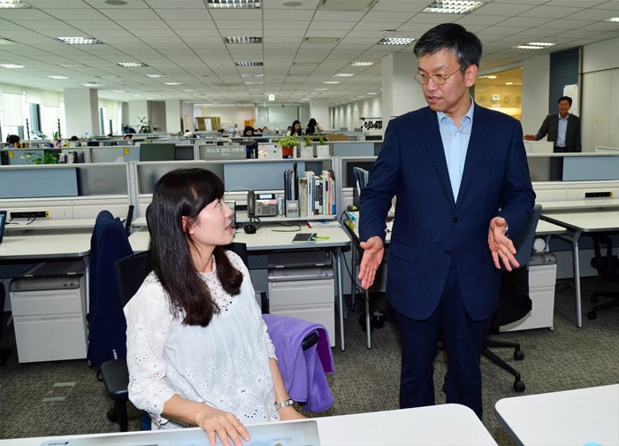 (서울=포커스뉴스) 최상목 기획재정부 차관이 21일 서울시 중구 아모레퍼시픽(유연근무제 및 일·가정 양립 모범기업) 본사를 방문해 출산을 앞둔 유연근무 직원과 대화하며 격려 및 애로 청취를 하고 있다. <사진제공=기획재정부>